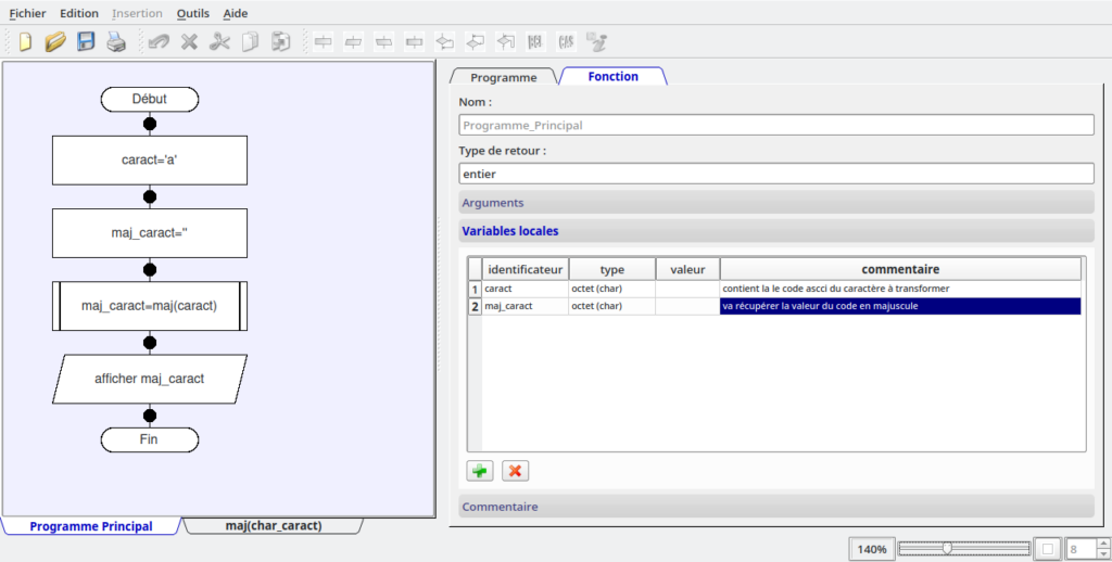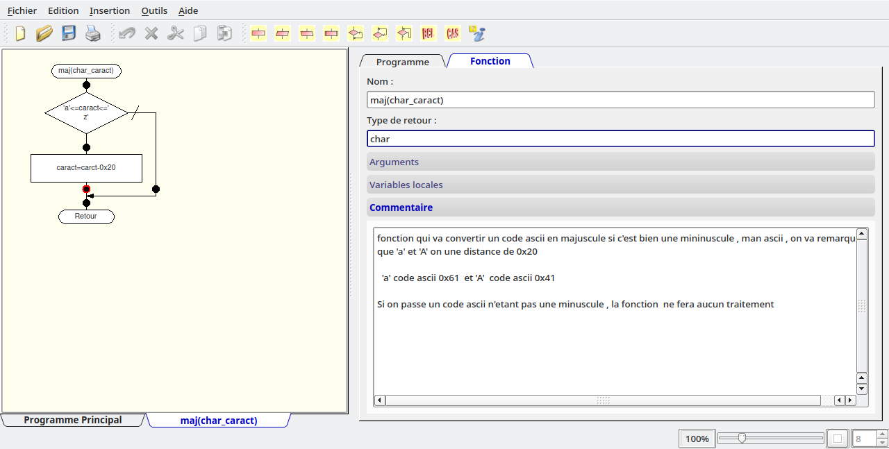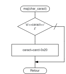 # ---------------------------------------------------------------------------- # Nom : maj.pl # Sujet : # Version : 0.1 # # Auteur : Prof # Création : 03/02/2026 # Mise à jour : 03/02/2026 # ---------------------------------------------------------------------------- # source généré par MoniaOrg version 0.38 Programme MAJ_TEST ; # annonces de sous-programmes FONCTION maj(char_caract) : char ; Prototype ; VAR caract : char ; maj_caract : char ; # fonction qui va convertir un code ascii en majuscule si c'est bien une mininuscule , man ascii , on va remarquer # que 'a' et 'A' on une distance de 0x20 # # 'a' code ascii 0x61 et 'A' code ascii 0x41 # # Si on passe un code ascii n'etant pas une minuscule , la fonction ne fera aucun traitement FONCTION maj(char_caract) : char ; DEBUT SI ( 'a'<=caract<='z' ) ALORS caract=carct-0x20 ; FINSI FIN # programme test de la fonction, ici c'est un programme de test unitaire VAR caract : octet (char) ; # contient la le code ascci du caractère à transformer maj_caract : octet (char) ; # va récupérer la valeur du code en majuscule DEBUTPROG caract='a' ; maj_caract='' ; maj_caract=maj(caract) ; afficher maj_caract ; FINPROG