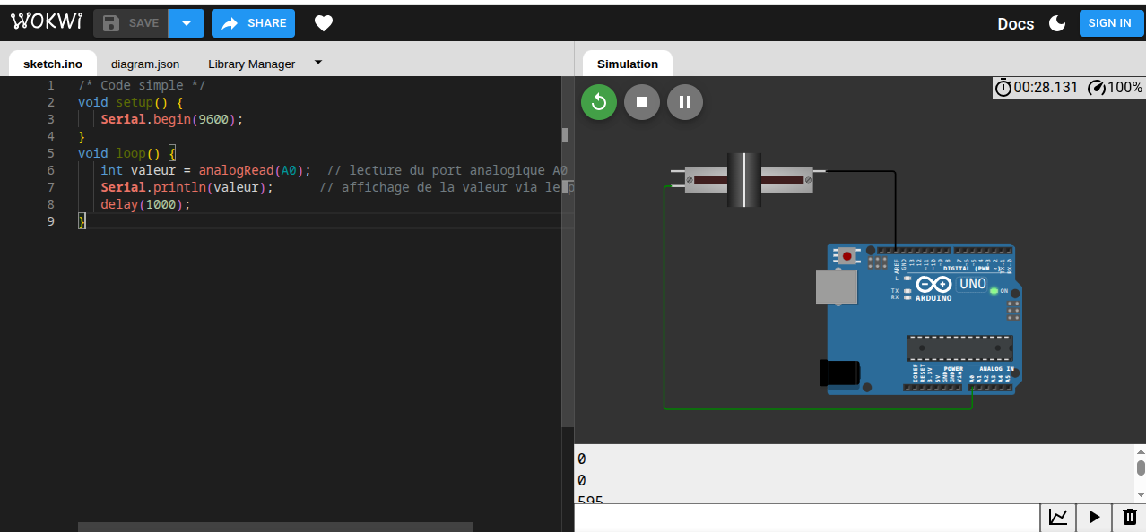 Exemple simple avec un potentiomètre sur A0, AREF non connecté donc a 5V par défaut