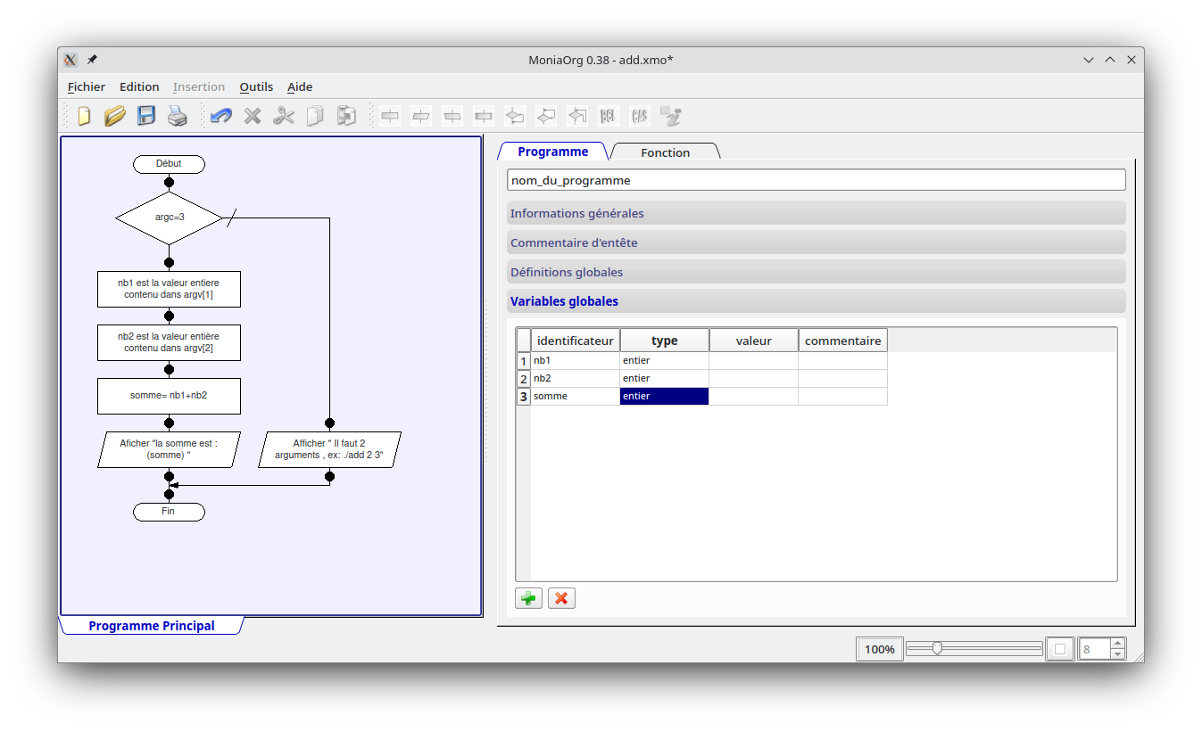 # ---------------------------------------------------------------------------- # Nom : add.pl # Sujet : Programme d'addition de 2 nombres # Version : 0.1 # # Auteur : Bogt # Création : 16/07/2025 # Mise à jour : 16/07/2025 # ---------------------------------------------------------------------------- # source généré par MoniaOrg version 0.38 Programme nom_du_programme ; ##FORWARDCOMMENT## VAR nb1 : entier ; nb2 : entier ; somme : entier ; DEBUTPROG SI ( argc=3 ) ALORS nb1 est la valeur entiere contenu dans argv[1] ; nb2 est la valeur entière contenu dans argv[2] ; somme= nb1+nb2 ; Aficher "la somme est : (somme) " ; SINON Afficher " Il faut 2 arguments , ex: ./add 2 3" ; FINSI FINPROG ~ ~ ~ ~ ~ 4,19 Tout
